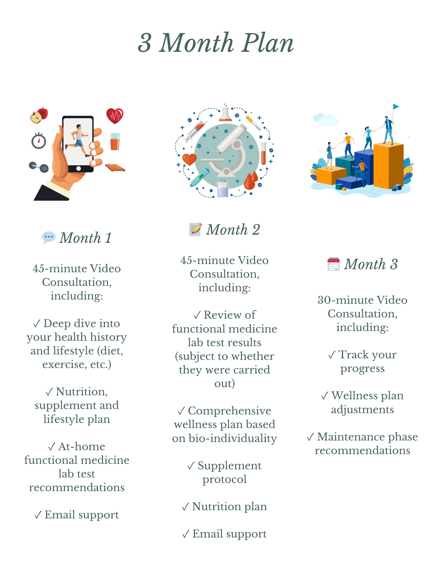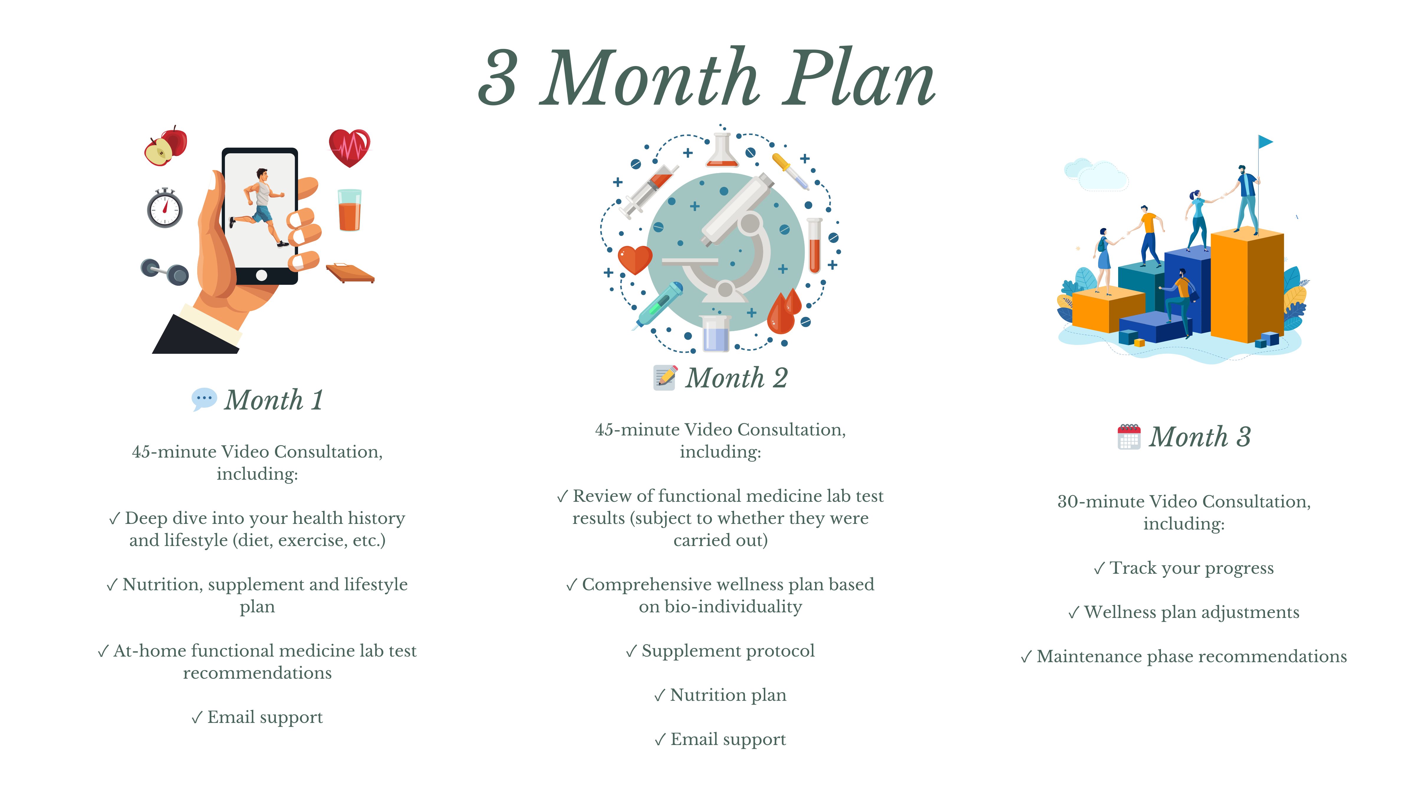 During the consultation, one of our expert health coaches will conduct a thorough examination of your health history, answer your questions and provide you with a personalised wellness protocol based on your presenting concerns. This will include diet, supplements and lifestyle recommendations. During this time, your health coach will also determine if any functional medicine labs or advanced protocols are needed, and if so, which ones would be best.