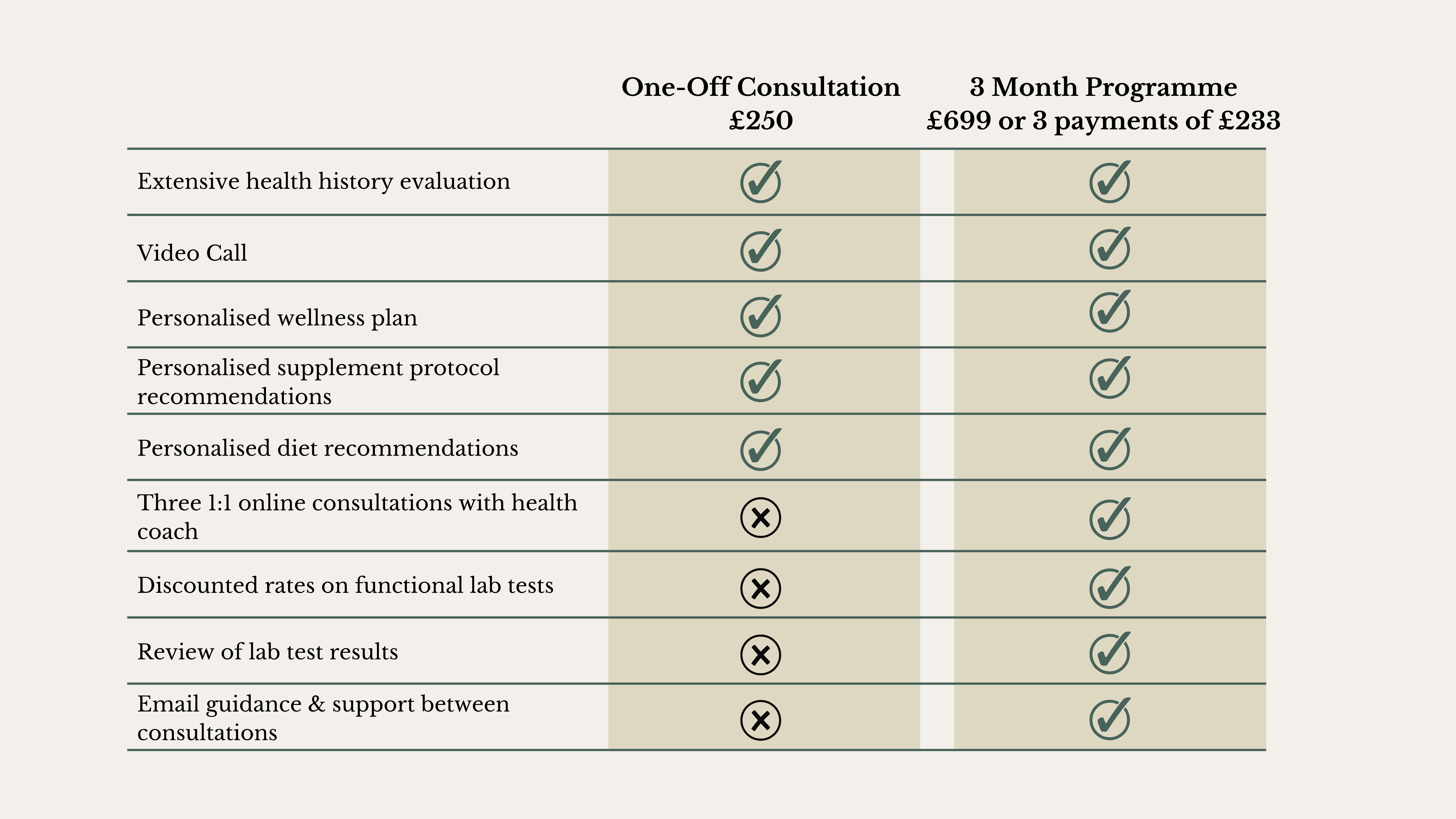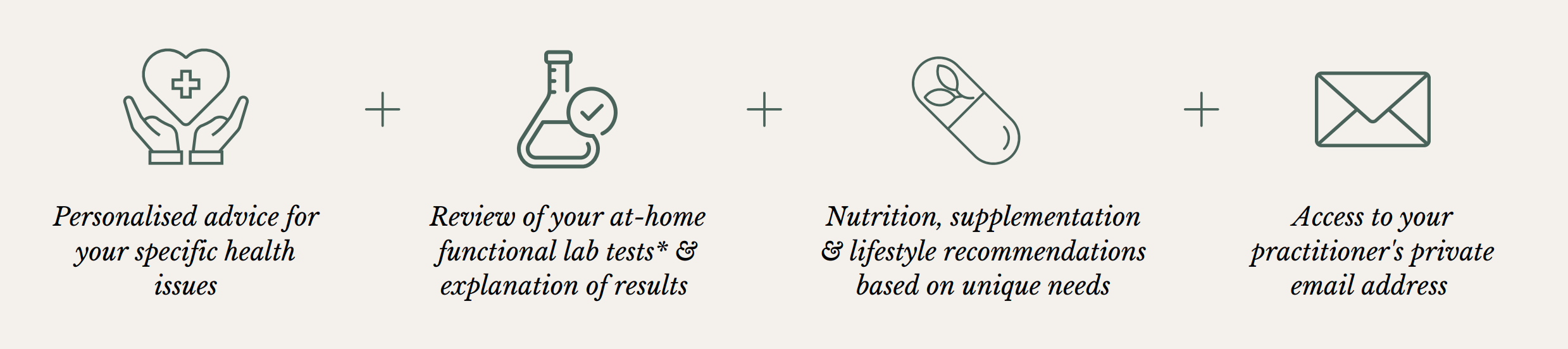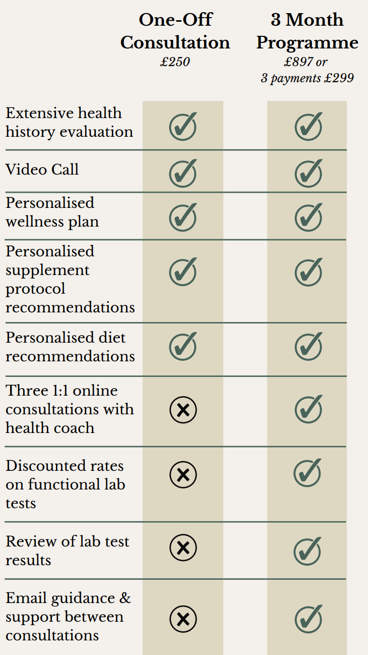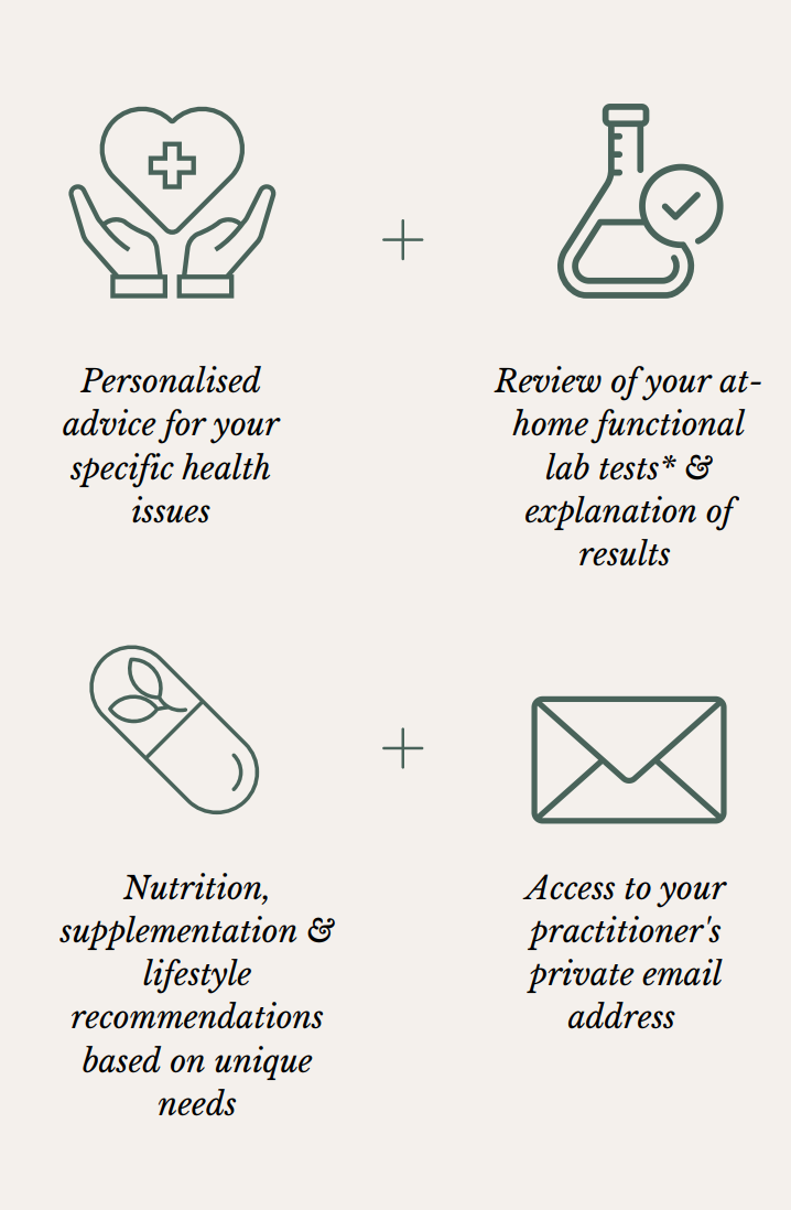 *At-home functional medicine lab tests are not included in the consultation price and need to be purchased separately. Lab testing is not imperative, but it is recommended. Lab testing will provide your practitioner with individualised results and information on your potential deficiencies and toxicities, which will allow them to provide an increasingly tailored service. Functional lab tests are usually not available through your conventional medical doctor and, therefore, will constitute an additional cost. Please note that your practitioner will not offer review of conventional blood work test results.